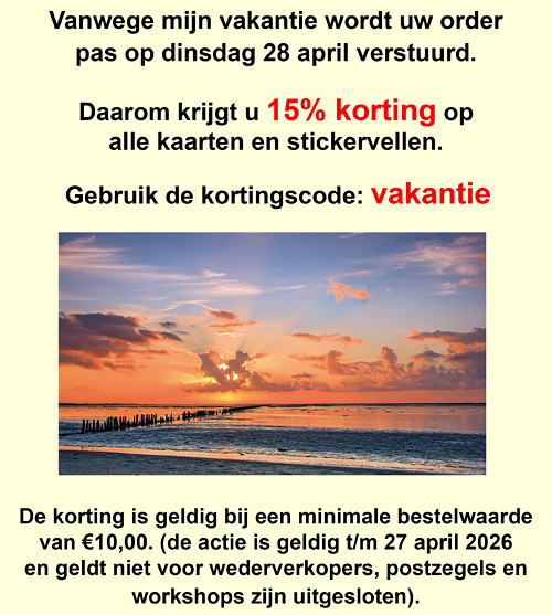 Wegens mijn vakantie krijgt u 15% korting op alle kaarten en stickervellen. Uw order wordt op dinsdag 28 april verstuurd. Gebruik kortingscode "vakantie".